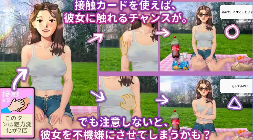 收集50+卡牌:对话、甜言蜜语、肢体接触、提问——每回合耗“能量”出牌,累积信任/魅力值